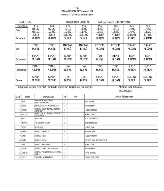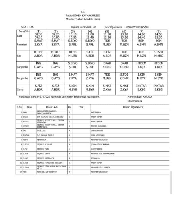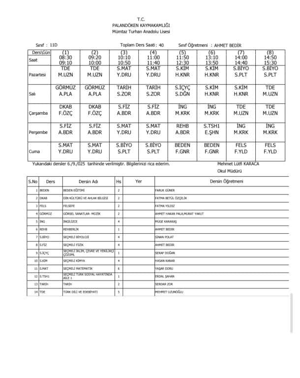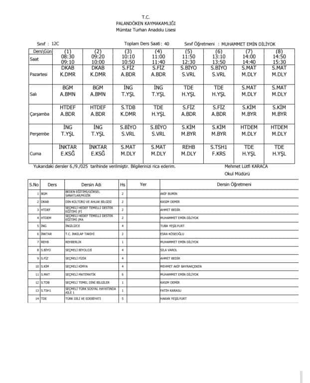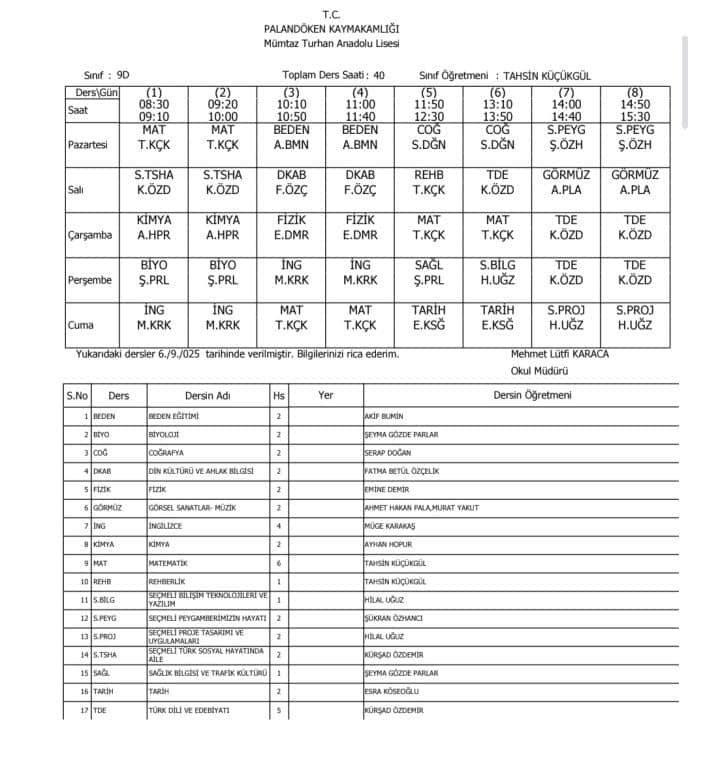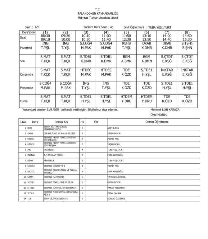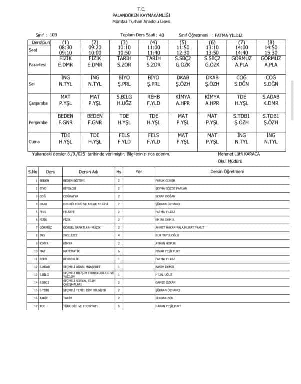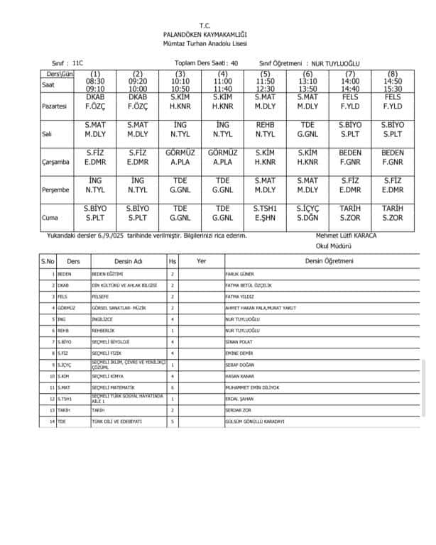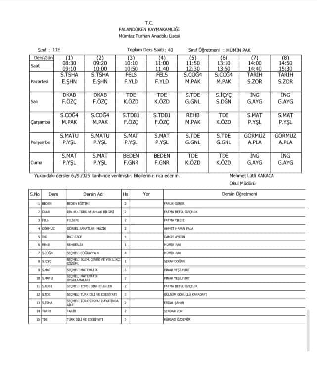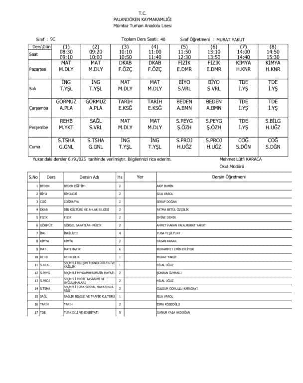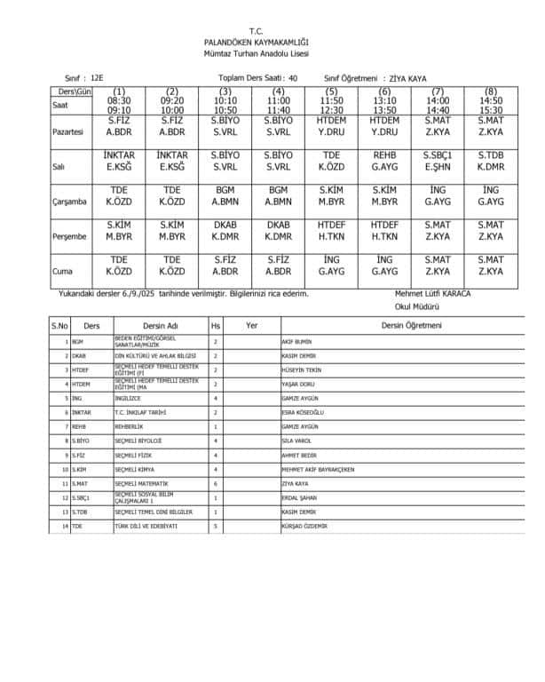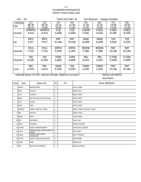 2025-2026 Egitim Öğretim Yılı Haftalık Ders Programı